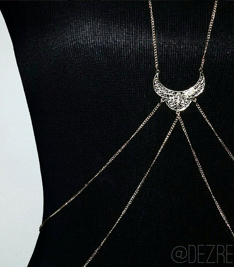 This piece, handmade by me, features silver plated chain.Make a statement with this one of a kind body chain!