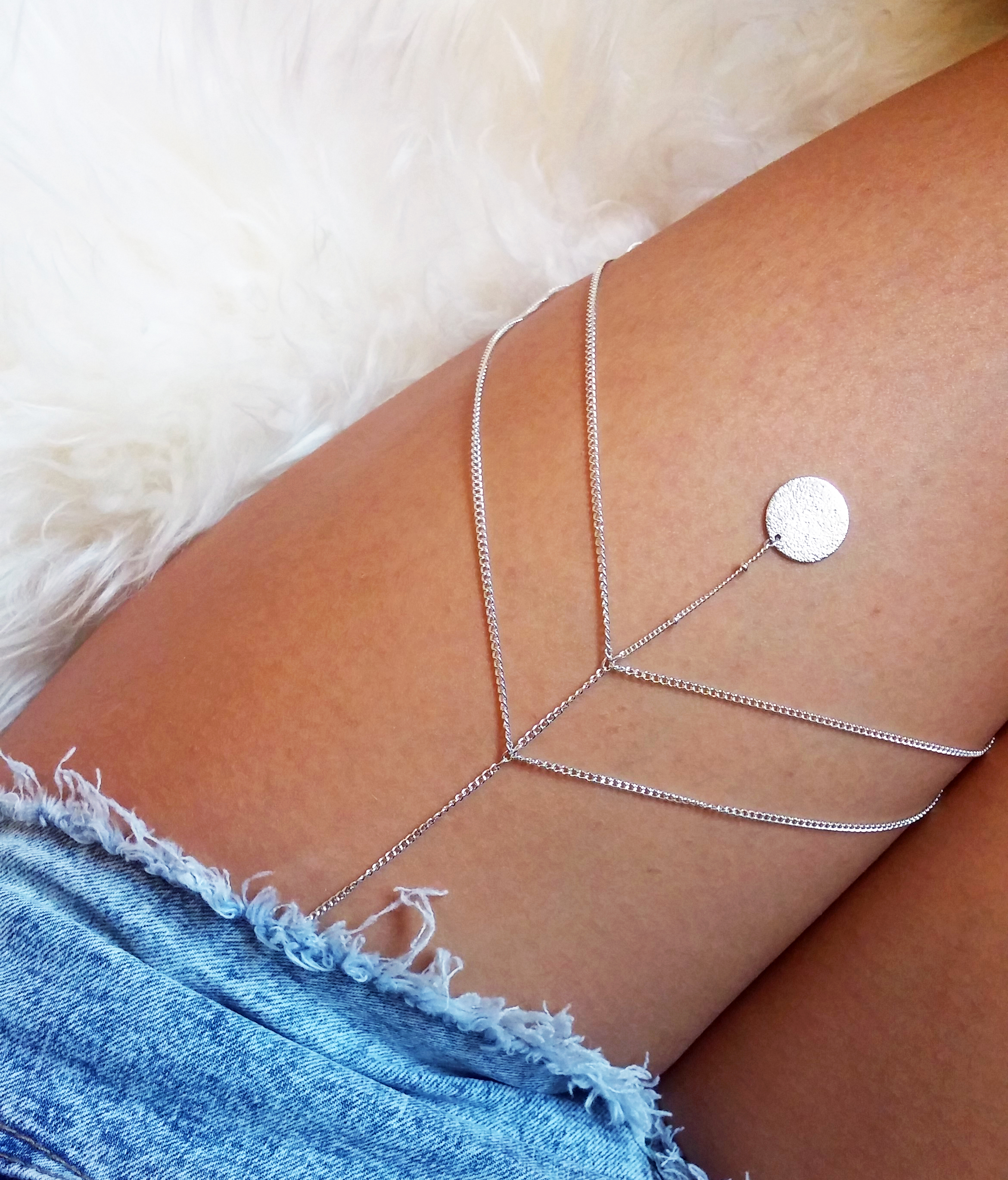 This silver plated thigh chain, handmade by me , is sewn to a stretchy garter. Perfect to wear under your shorts, dresses, or skirts! The pendant is featured on front of the chain only.