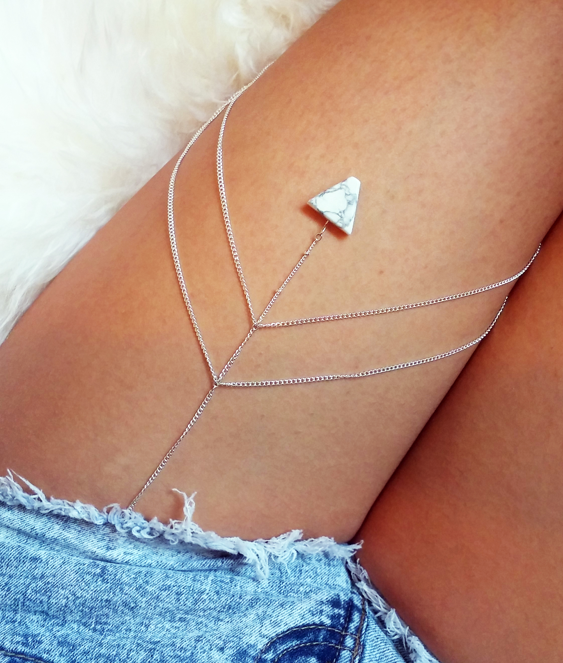 This silver plated thigh chain, handmade by me , is sewn to a stretchy garter. Perfect to wear under your shorts, dresses, or skirts! The white howlite stone is featured on front of the chain only.