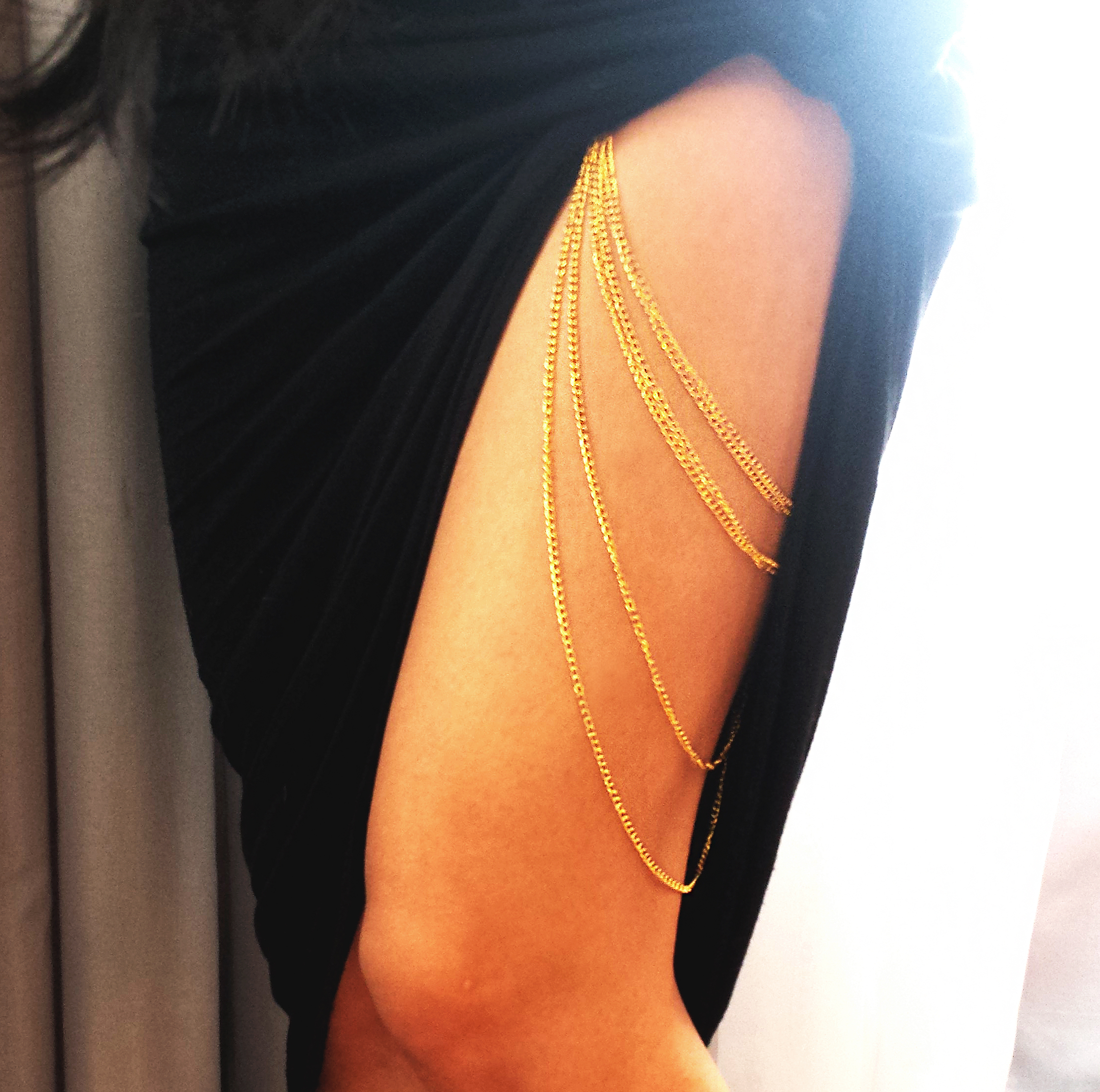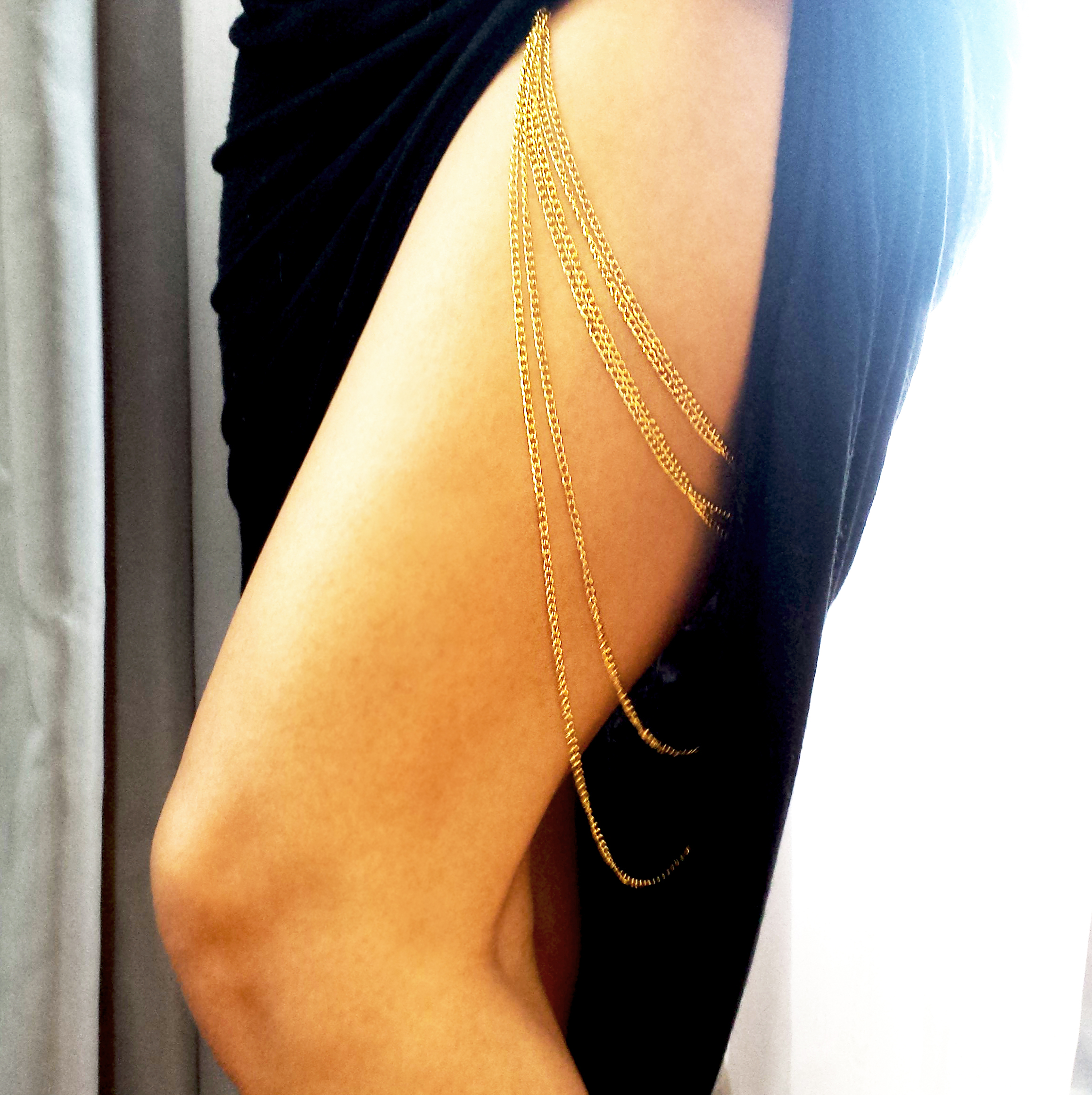 Looking for a thigh chain for elegant outfit? Wear our gold plated Jada Thigh Chain with your favourite skirts and dresses! Chain is sewn on to a stretchy garter for maximum comfort.