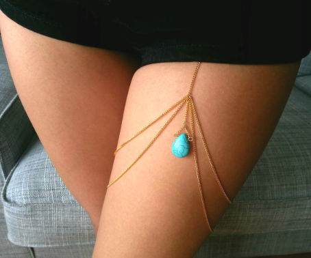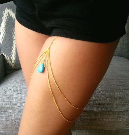 This gold plated thigh chain, handmade by me , is sewn to a stretchy garter. Perfect to wear under your shorts, dresses, or skirts! Turquoise stone is featured on front of the chain only.